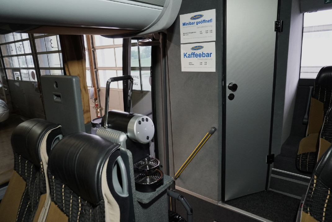 30 + 1 PassagierplätzeUnser kleiner Reisecar ist mit Toilette, Kaffeemaschine und Kühlschränken ausgestattet. Die Hutablage, sowie die grossen Kofferräume bieten Stauraum für Gepäck. Die seitlich und nach hinten verstellbaren Sitze sorgen für zusätzlichen Komfort während der Fahrt.